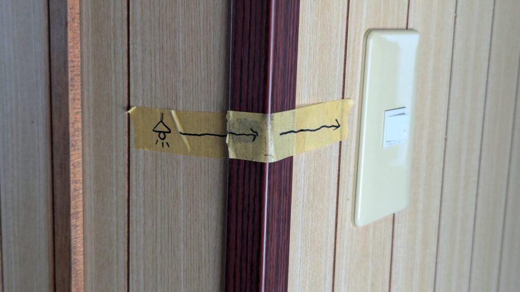 仕事部屋のトイレのライトいつも聞かれるからマスキングテープで書いた思い出11年前の