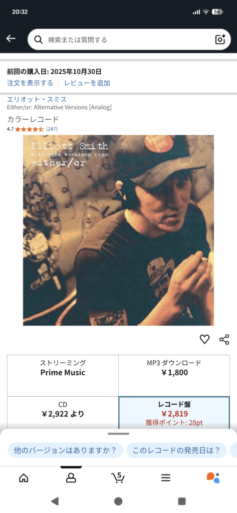 エリオットスミスのレコード LPかと思いきやSP アルバムとほぼ同じジャケットってややこしすぎ